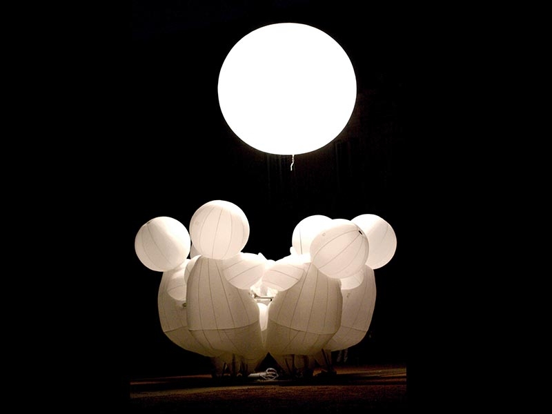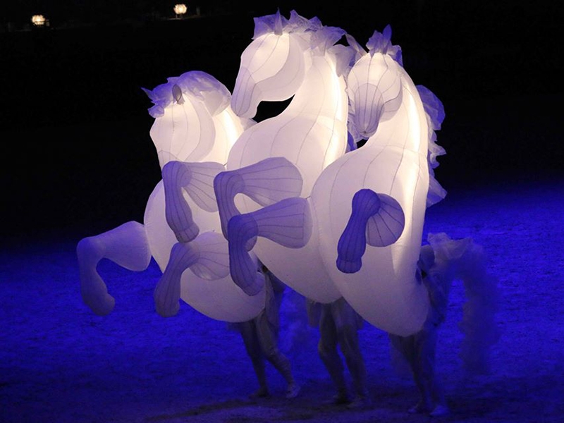 There are giant costumes filled with air and manipulated by an actor. When these mysterious creatures join themselves, the get alive with light and present a magical choreography.
