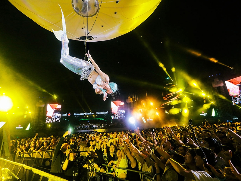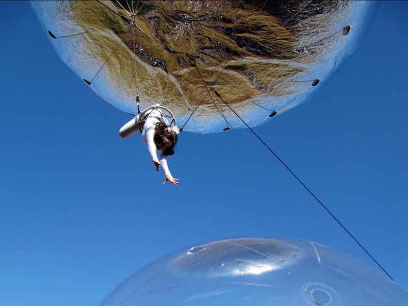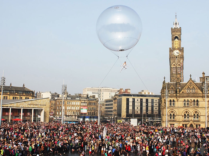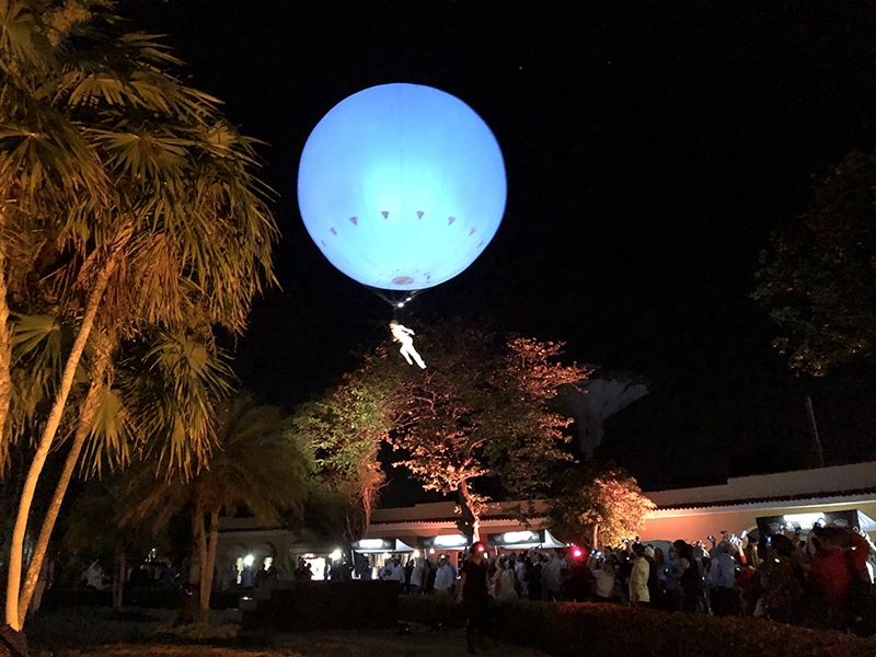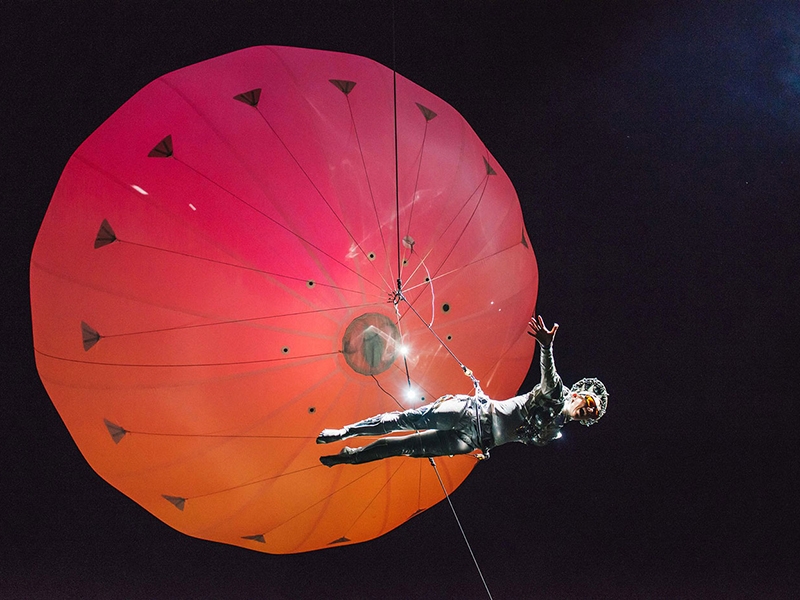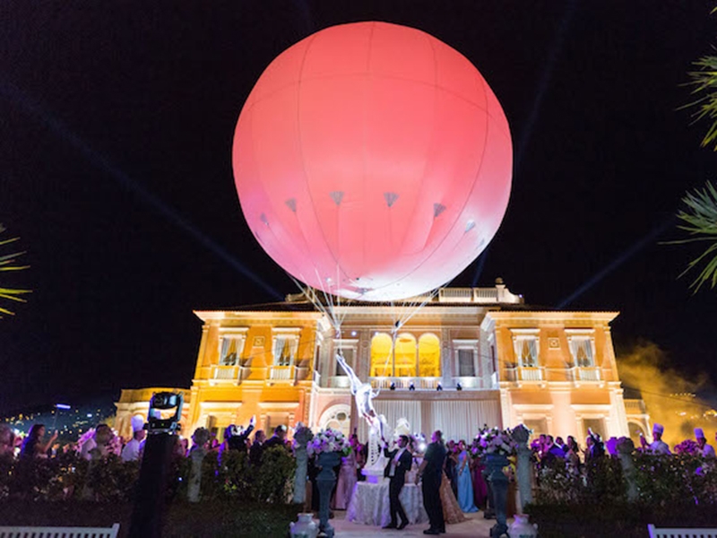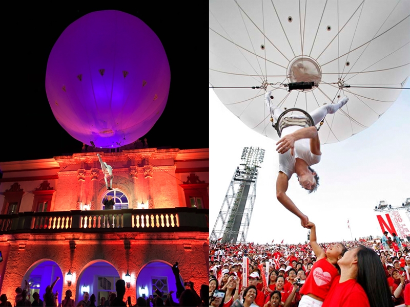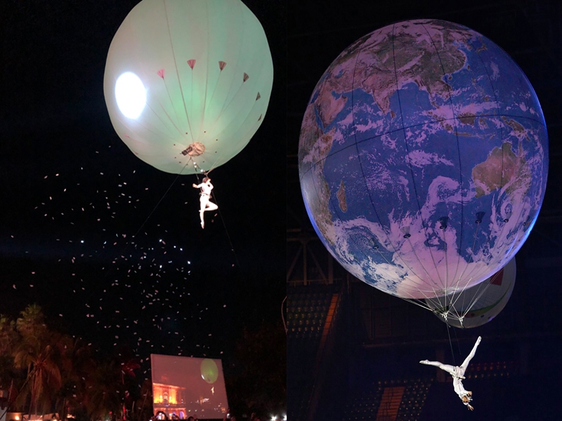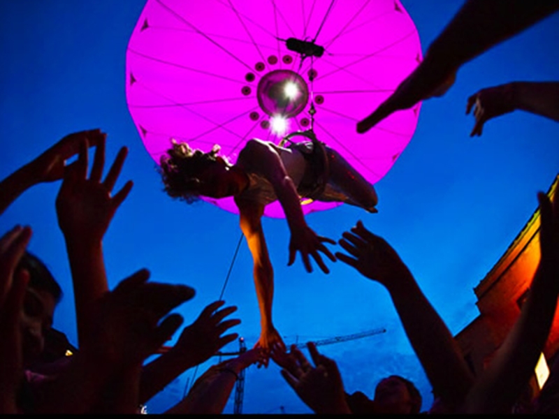 Thinking for promotions and events taking place in spaces of large events. Show where the artist hangs from a helium balloon also has custom lights.
