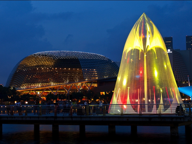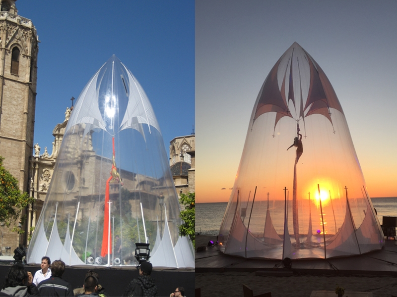Evoking lines of gothic vaulted ceilings; this structure has resonances from the past but is definitely something from the future. Filling with air from flat, it inverts, and, lifting the aerialist with it, the Diamond creates images of a giant unfolding orchid before achieving a full 11m high, a taut crystalline form. Lighting changes colour on the internal and external facets while the aerialist dances at seven metres high inside.
