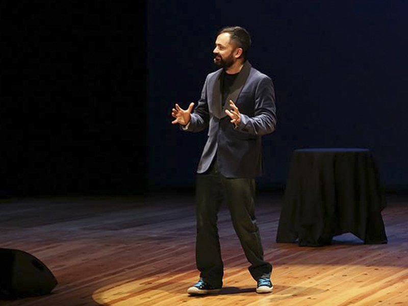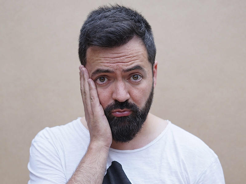 An ARTIST that with humor will impregnate the event with current news, the day to day, the surrealism that floods his mind. His show: stand up comedy, with a lot of improvisation, with cabaret airs and where the fourth wall disappears completely. Pure energy on the stage to make a unique moment full of content and message. Curious traveler formed between Barcelona, Madrid, London, New Jersey and California. He went to high school in the United States with the complete kit of student by USA: graduation, dance and locker in the halls. That encouraged him, some time later, to knock on Judy Carter's door and train in comedy with the creator of "The Comedy Bible".