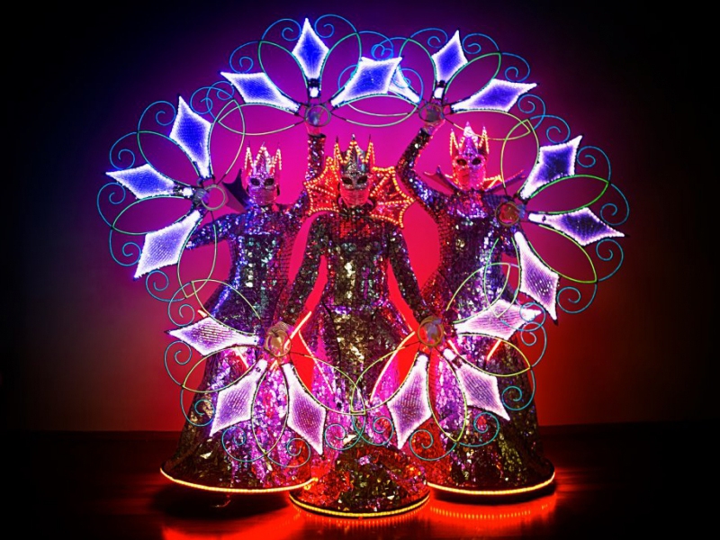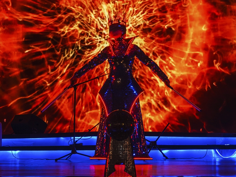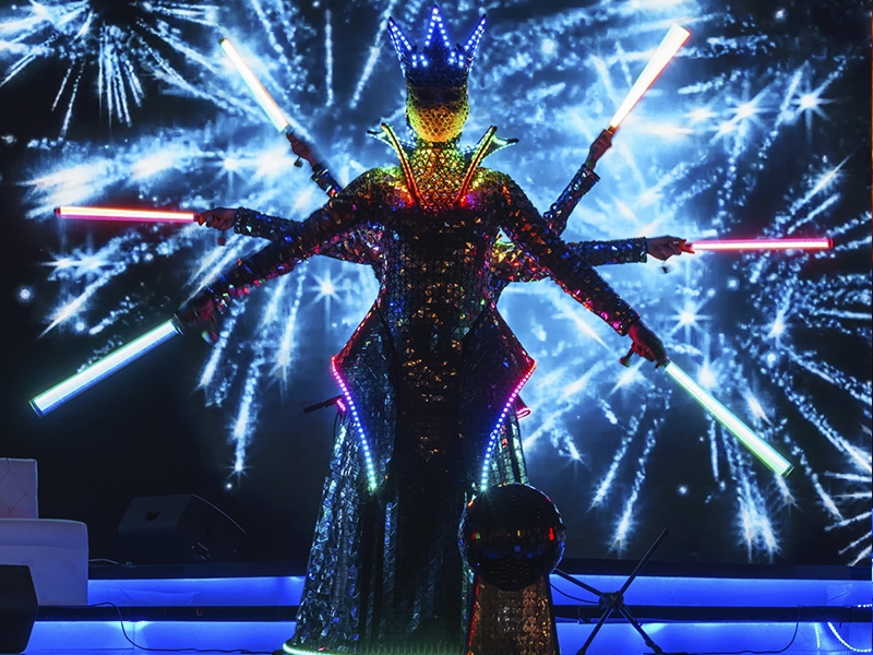 Sparkly show full of light, laser effects and colour led lights, bringing the maximum energy on stage. A stunning clothing made of hundreds of miniature mirrors and a careful look after staging to the smallest detail makes this artistic proposal one of the most striking ones of the moment. Furthermore, it can be personalised with the appearance of a logo or a word right at the end of the show in accordance with the objectives of the event. If the event requires it, there is the option of adding a close up performance, during which our artist can pose with the guests to take pictures, in a real photocall or in a more improvised manner.