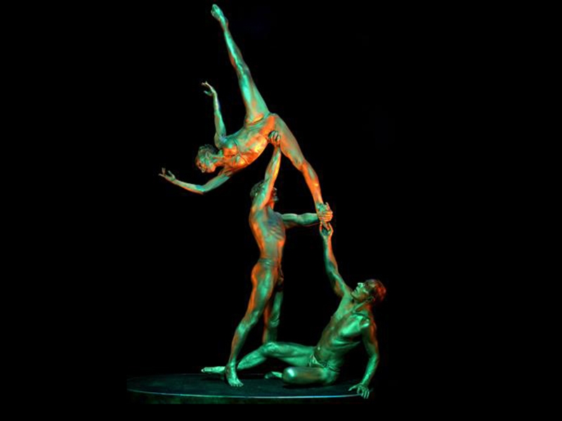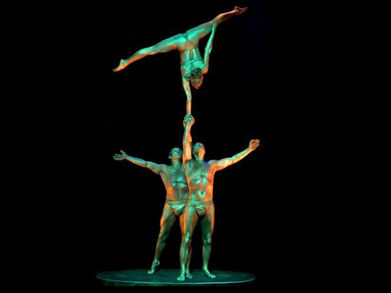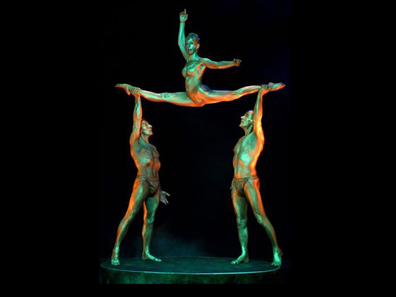 A marble pedestal, three artists dressed as golden statue move slowly. Performing an adagio style, they create unbelievable positions and movements. Poetic and emotional, the performance is a breathtaking moment for all the audience.