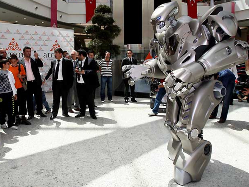 Giant Robot records and sends to its operator all data about his direct environment, so that the operator can take decisions about his coming moves. The robot imitates the moves of the operator, enabling moves very similar to a human being.