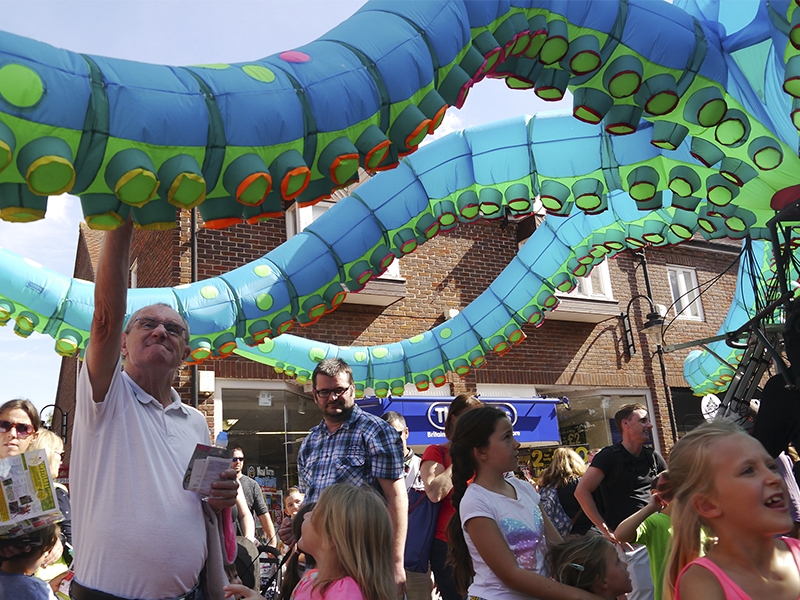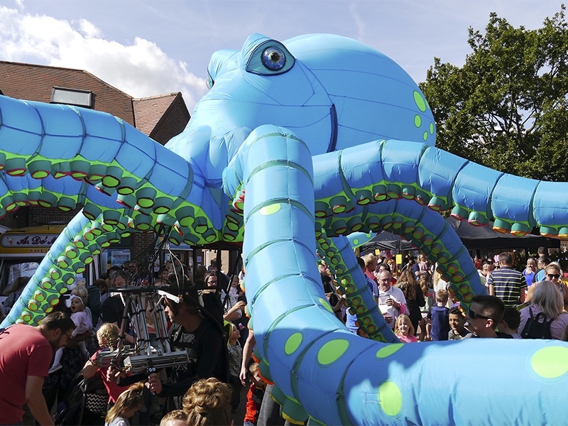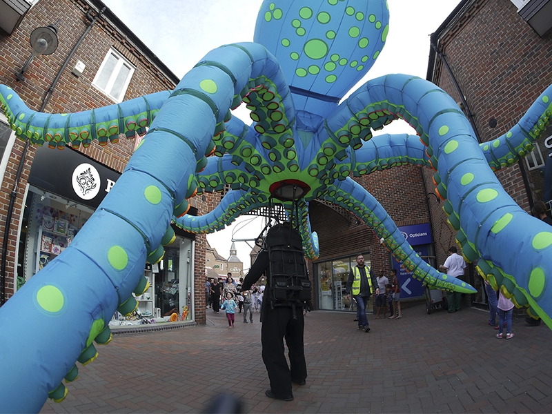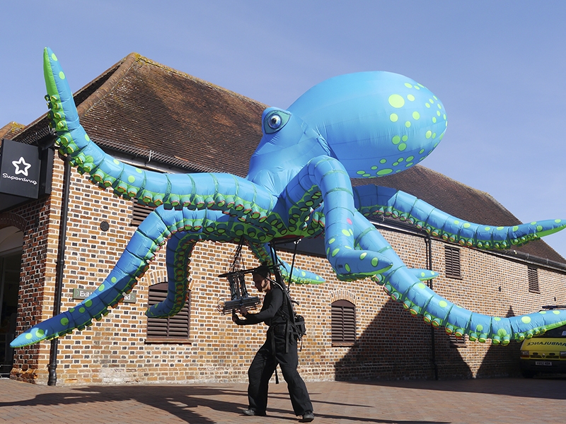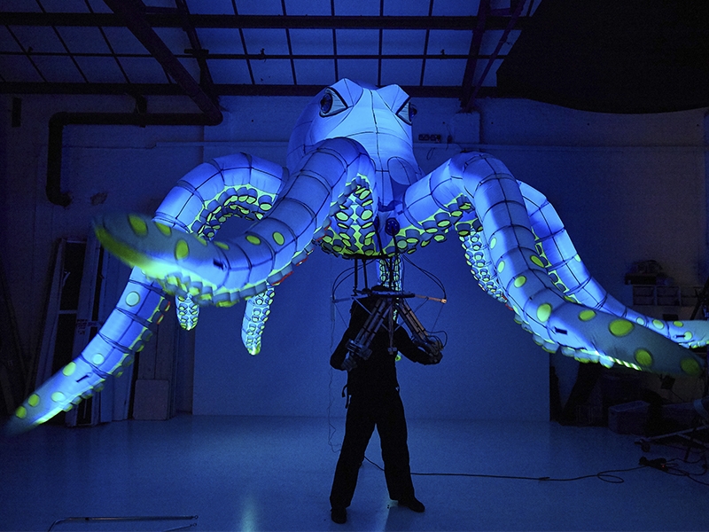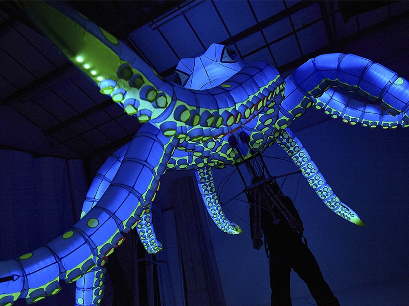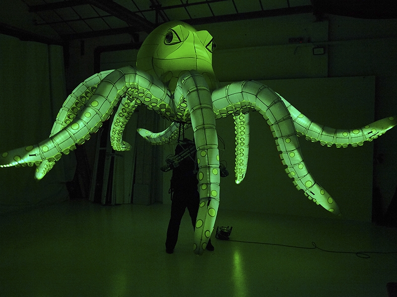 We propose a beautiful parade in the shape of a giant octopus. Octopus is an awe inspiring, giant, inflatable octopus puppet with 8 fully articulated legs. Operated by one puppeteer, massive in scale for impact in crowds, it's easy to manoeuvre, enabling fun close up exchanges with its audience. It also has a programmable LED lighting scheme for night performances.