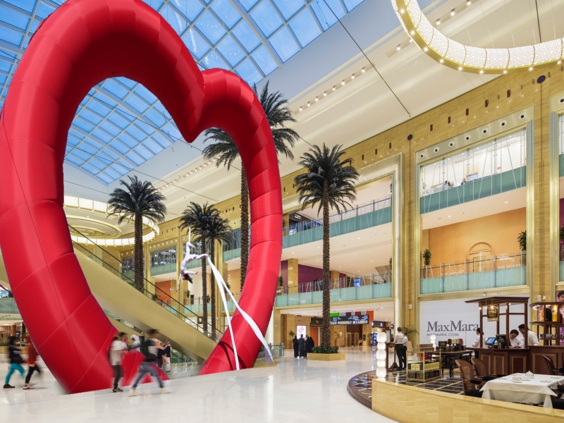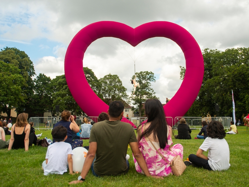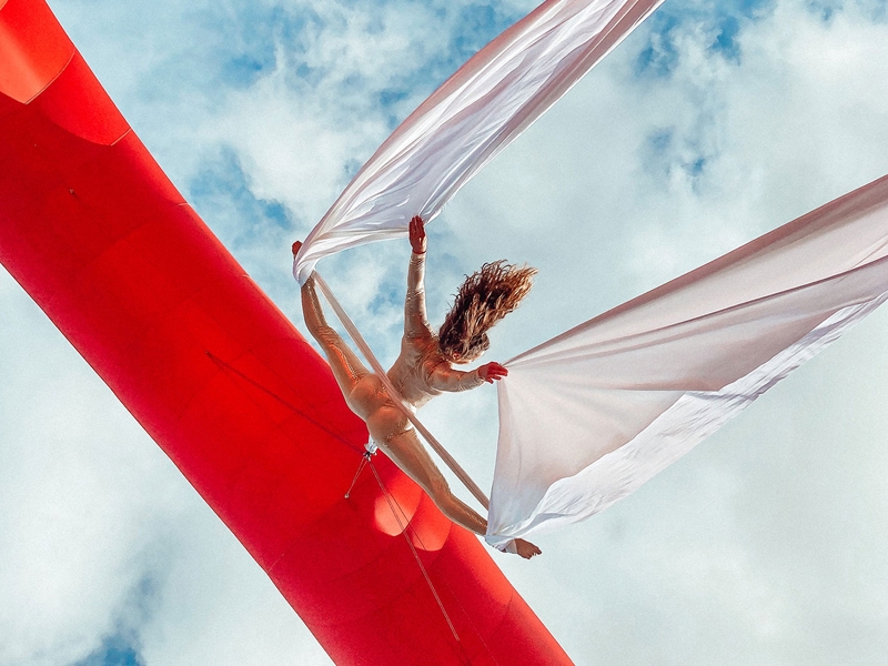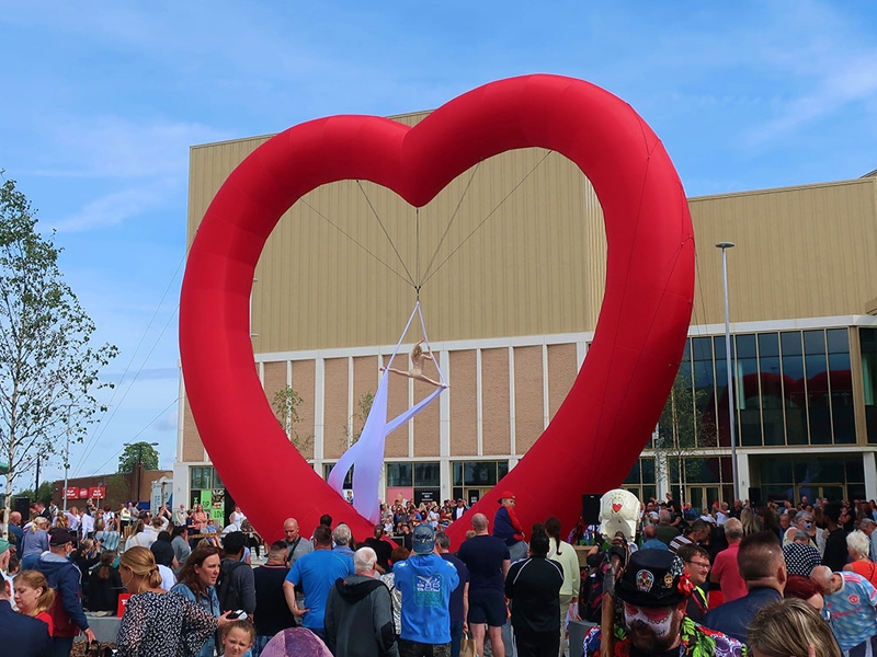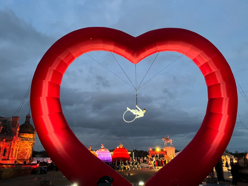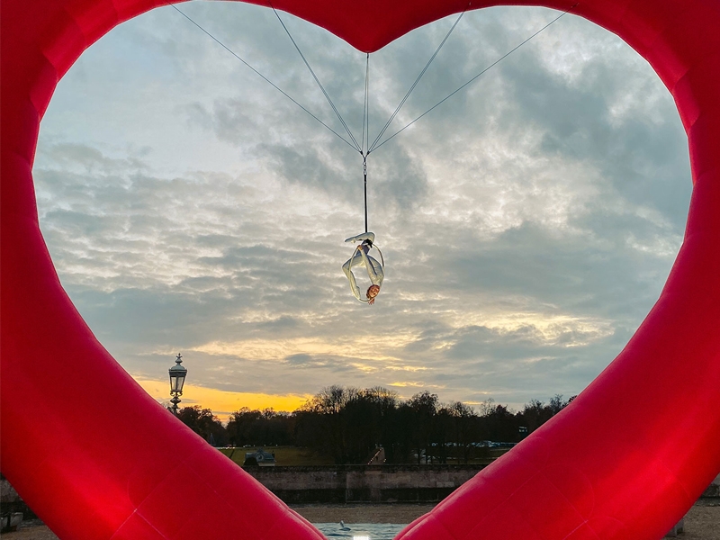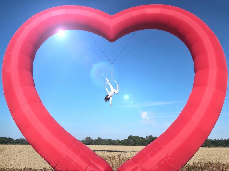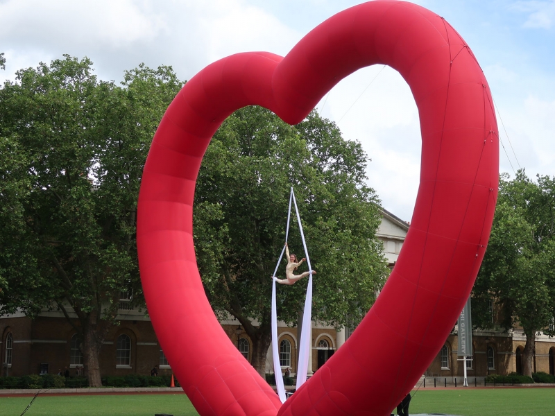 A 12.5m high, air-filled structure that frames an elegant aerial performer. Fluctuations in pressure cause the heart to slowly pulse during the show.